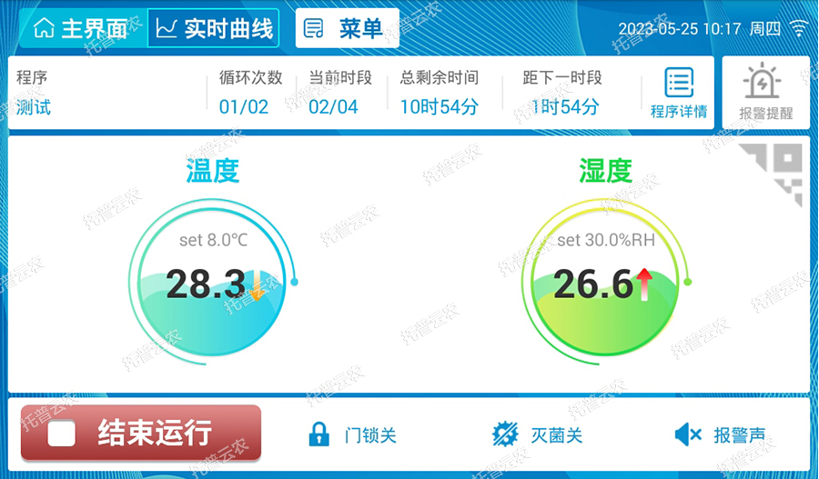 運(yùn)行狀態(tài):可查看溫度、濕度,程序、循環(huán)次數(shù)、時(shí)段、剩余時(shí)間等。