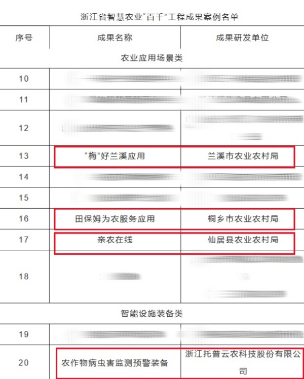 近日,浙江省農(nóng)業(yè)農(nóng)村廳公布了2023年度浙江省智慧農(nóng)業(yè)“百千”工程成果案例。其中,由浙江托普云農(nóng)科技股份有限公司(下稱“托普云農(nóng)”)自主研發(fā)的“農(nóng)作物病蟲(chóng)害智慧測(cè)報(bào)系統(tǒng)”成功入選智慧設(shè)施裝備類案例;托普云農(nóng)全資子公司——浙江森特技術(shù)支撐建設(shè)的“梅”好蘭溪應(yīng)用、田保姆為農(nóng)服務(wù)應(yīng)用、親農(nóng)在線成功入選農(nóng)業(yè)應(yīng)用場(chǎng)景類案例。